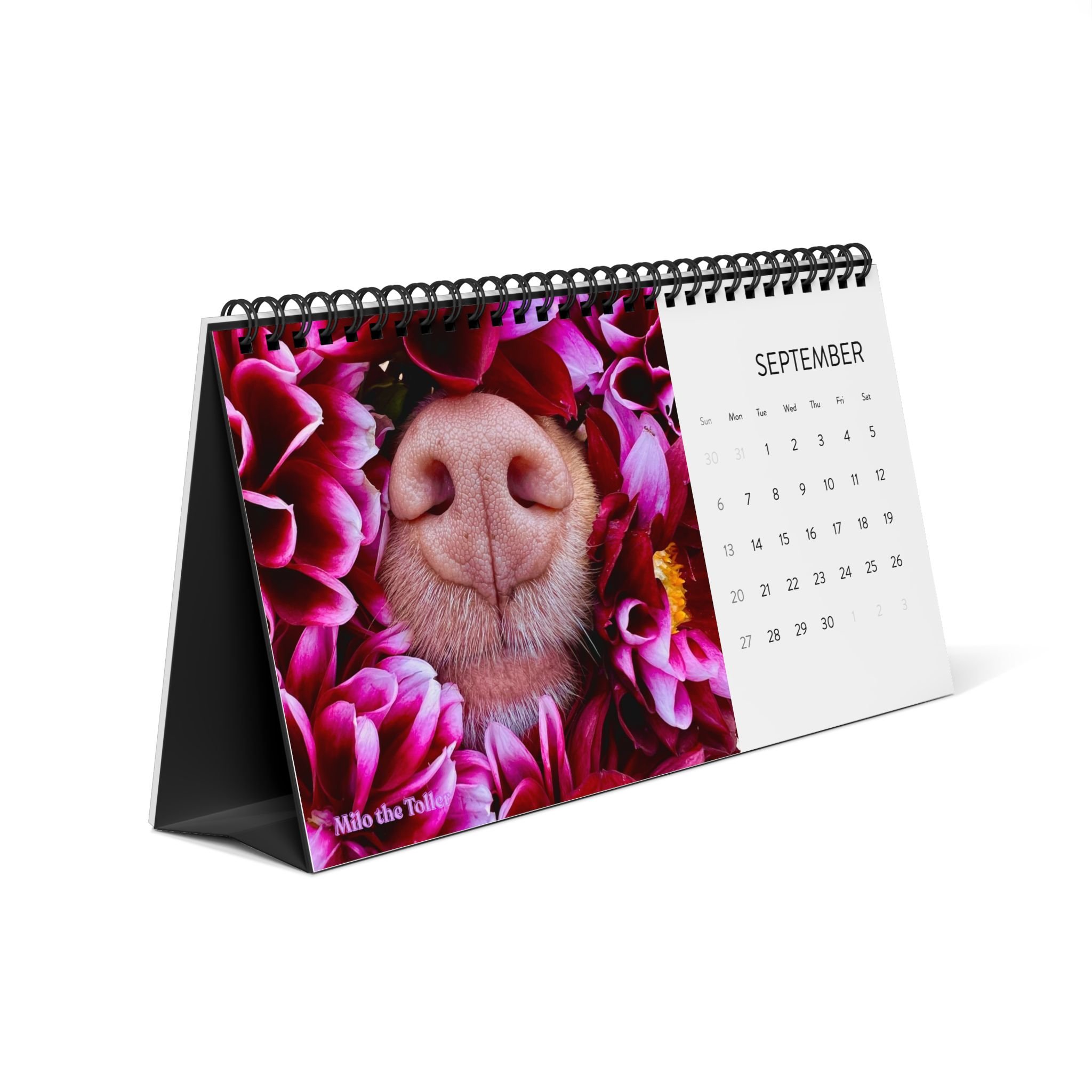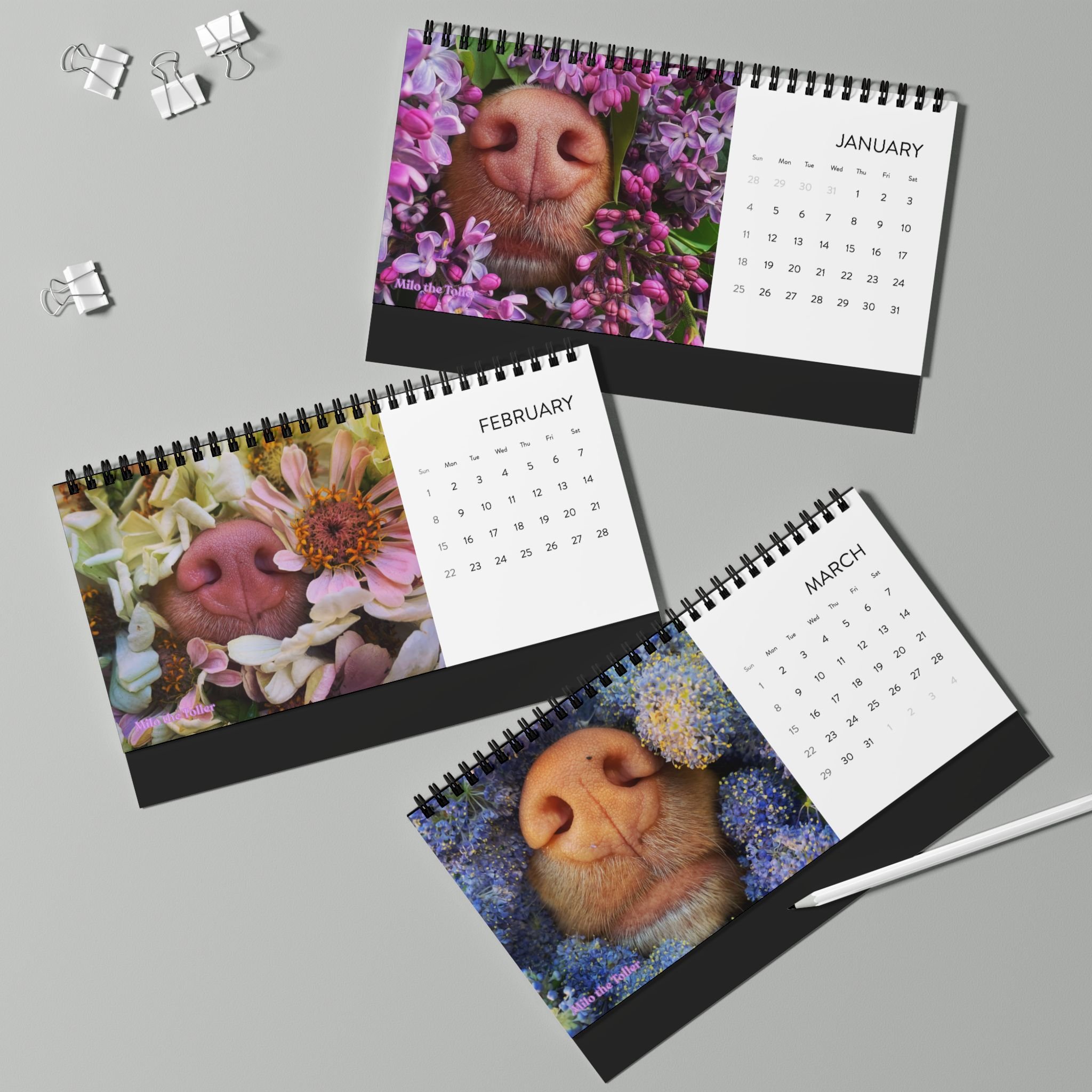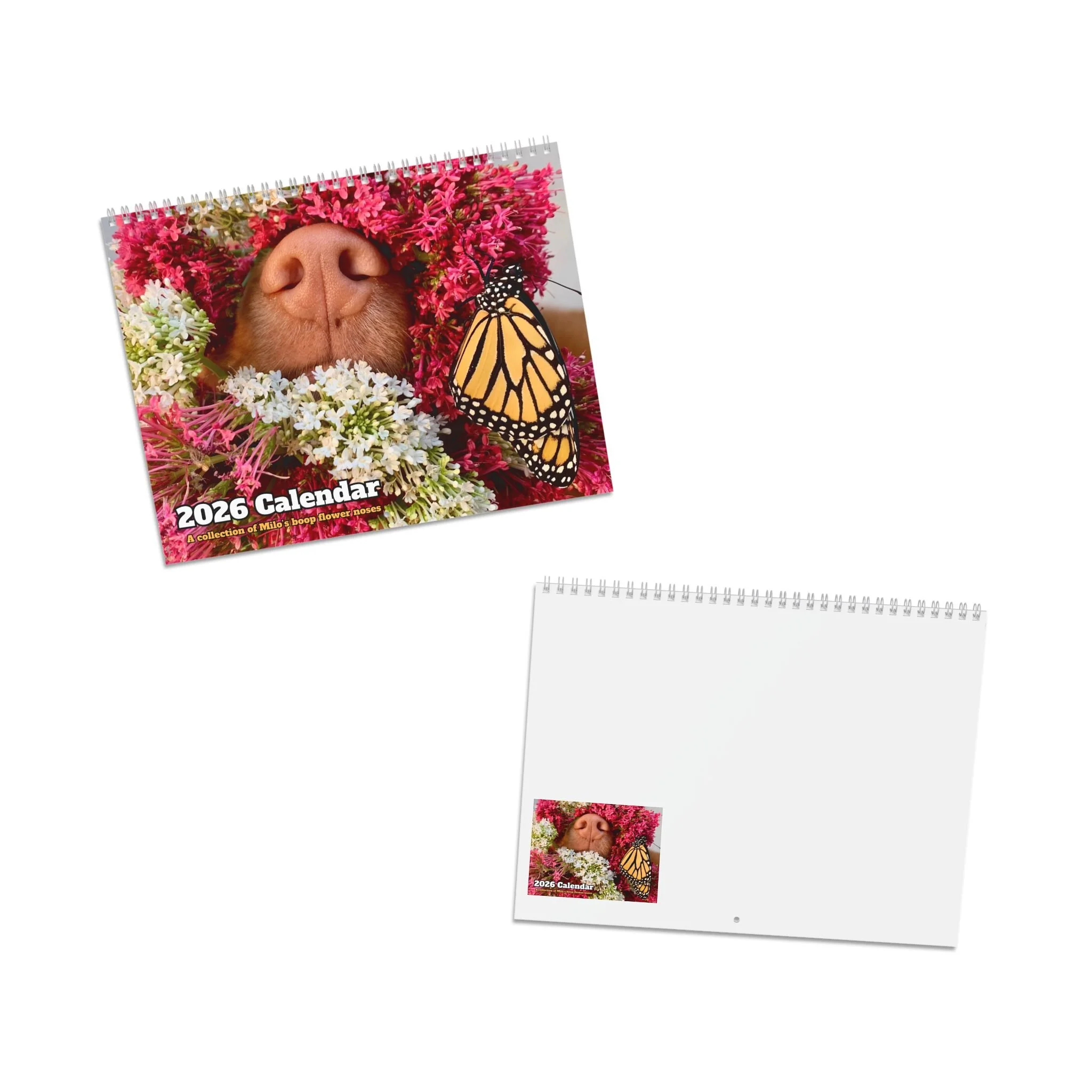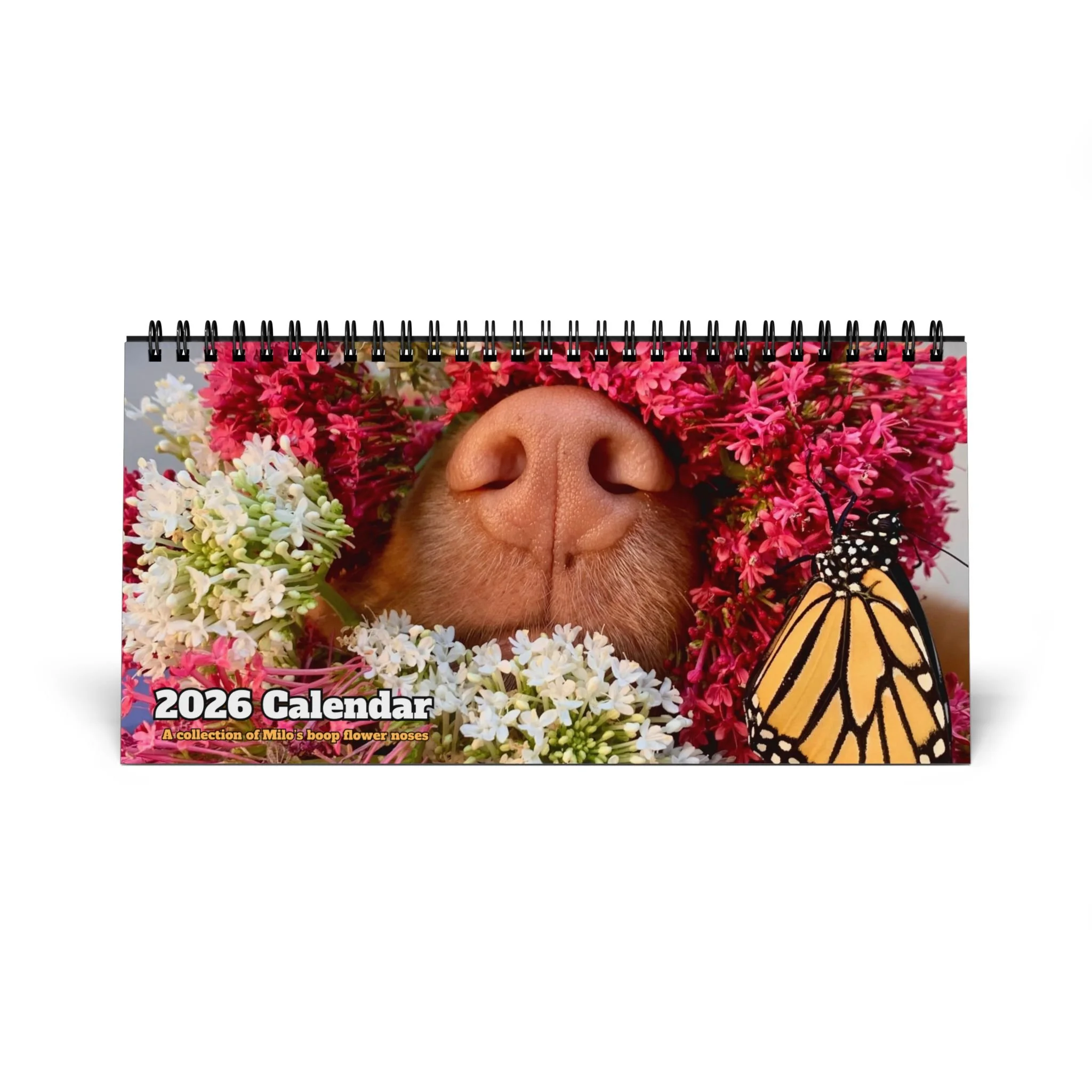 Categories: All Phone Case Notebooks Tote Bag Mouse Pads Mugs Magnet Donation Sticker Cards Calendar Prints All / Calendar Floral Boop Nose Milo Desktop Calendar - 2026 Desk Planner $20.00 2026 Milo's Farm Calendar $25.00 2026 Milo's Boop Nose Calendar $25.00